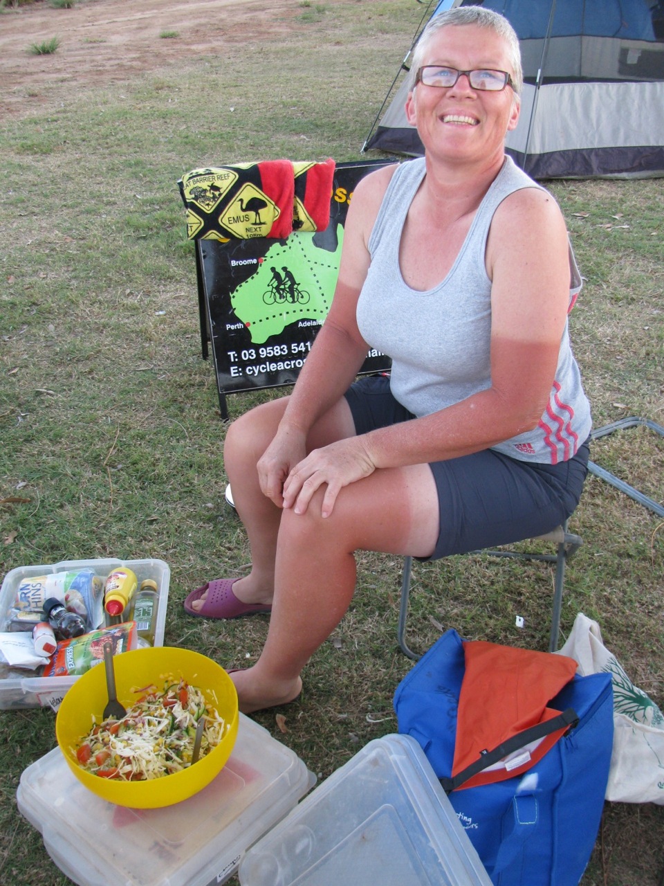 A couple of dramas with Jacqui & Melanie both falling off their bikes. No injuries were received but Princess’s pride was slightly dented as she fell off in the middle of town. Morning tea was very nice today as John donated a fruit cake to the group- I have another one somewhere but am having trouble locating it. The supplies are dwindling and everyone is looking forward to a big food shop tomorrow when we get into Carnarvon.